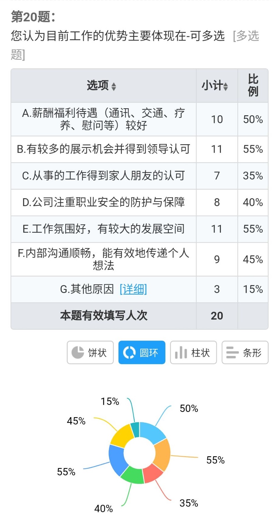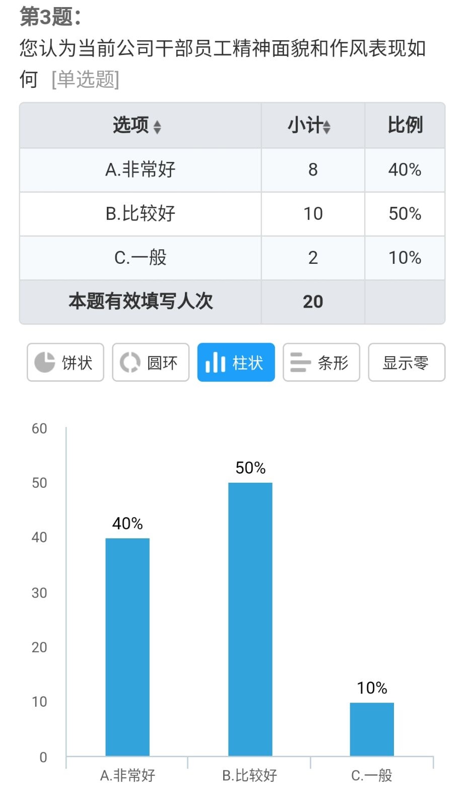 調(diào)研采用發(fā)放網(wǎng)絡(luò)問卷的方式,要求職工在線上進行填寫,共發(fā)放20份,收回20份,問卷內(nèi)容涵蓋各科室、各年齡段以及不同性別,具有普遍性和代表性。通過網(wǎng)絡(luò)后臺統(tǒng)計匯總出的數(shù)據(jù),公司能夠比較全面且直觀地了解干部職工的思想狀況及其動態(tài)變化,包括對公司各項工作、對企業(yè)改革發(fā)展的真實想法以及對個人職業(yè)發(fā)展的規(guī)劃和在工作、生活等方面的迫切需求。