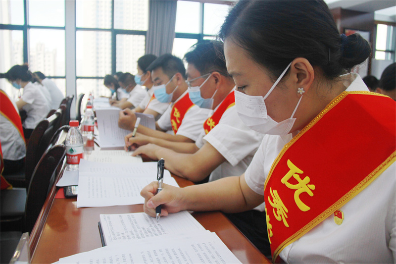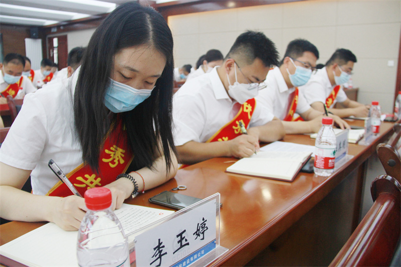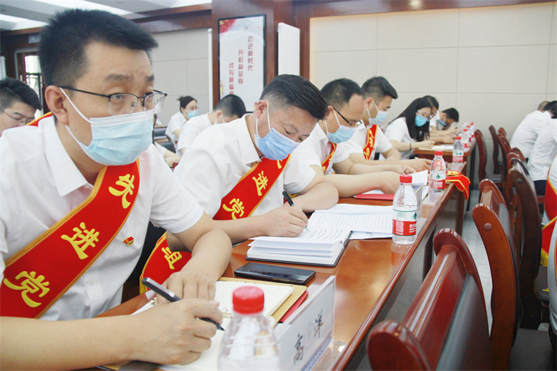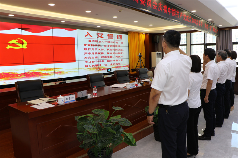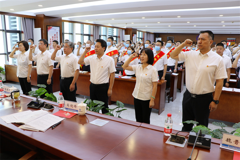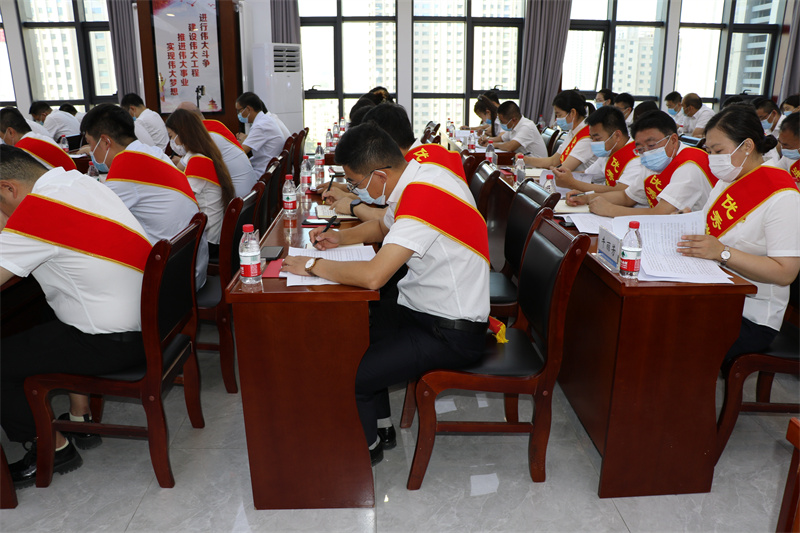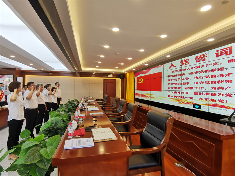 會上,在黨委書記、董事長張國虎的帶領下,全體黨員面向黨旗莊嚴宣誓——老黨員重溫入黨誓詞,新黨員進行入黨宣誓。