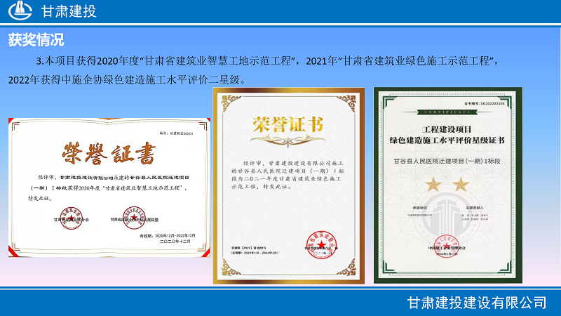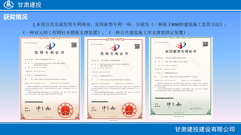 此前該項(xiàng)目還授權(quán)發(fā)明專利2項(xiàng)、實(shí)用新型專利1項(xiàng),獲評(píng)省級(jí)工法1項(xiàng),獲得省、市級(jí)文明工地、甘肅省建筑業(yè)智慧工地示范工程、甘肅省建筑業(yè)綠色施工示范工程、綠色建造施工水平評(píng)價(jià)二星級(jí)、首屆(2020)全國數(shù)字項(xiàng)目大獎(jiǎng)賽二等獎(jiǎng)等獎(jiǎng)項(xiàng)。