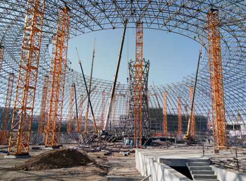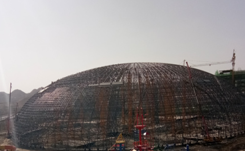 直屬項(xiàng)目部主要承建室內(nèi)水上樂園、溫泉度假酒店、會(huì)議中心及輔房四個(gè)單體,水上樂園室內(nèi)館工程是西部恐龍園水世界的核心地標(biāo)性建筑,是水世界的標(biāo)志性建筑,建筑形式為雙螺旋球網(wǎng)架,基礎(chǔ)形式為樁筏聯(lián)合,井樁共計(jì)473根,整體建筑為橢圓形建筑,其中長(zhǎng)軸200米,短軸176米,網(wǎng)架中心建筑高度為40米,是目前西北最大的雙螺旋球網(wǎng)架結(jié)構(gòu)建筑。