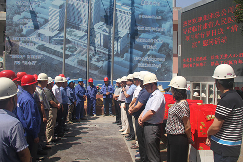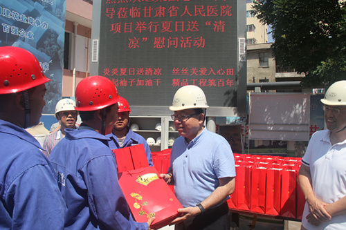 為確保施工生產(chǎn)一線職工在高溫酷暑季節(jié)身體健康和工作安全,7月18日下午,甘肅建投總經(jīng)理蘇躍華帶領(lǐng)集團(tuán)總公司有關(guān)處室負(fù)責(zé)人來(lái)到省人民醫(yī)院住院部二期7#、8#樓項(xiàng)目部慰問(wèn)在炎炎夏日仍堅(jiān)持奮戰(zhàn)在生產(chǎn)一線的廣大職工,及時(shí)為他們送去了防暑降溫用品。