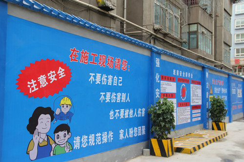 該項(xiàng)目現(xiàn)場較為狹小,場地及工作面都很緊張,但做到了國家及公司對標(biāo)準(zhǔn)化文明施工現(xiàn)場的各項(xiàng)要求:3#綜合樓緊鄰的建工中街由一個跨度為10米的安全防護(hù)棚和一個4米的人行道防護(hù)棚組成防護(hù)體,對馬路上來往的車輛、行人及商鋪經(jīng)營者和辦公區(qū)工作人員進(jìn)行有效的保護(hù)。進(jìn)入施工現(xiàn)場,映入眼簾的是一道整齊、規(guī)范的安全警示宣傳文化墻,包含整容鏡、公示欄、宣傳欄、安全講評臺、總平面布置圖、消防臺等內(nèi)容;正對大門的茶水亭、吸煙室也較為醒目;現(xiàn)場共分為鋼筋加工區(qū)、木工區(qū)、周轉(zhuǎn)料堆放區(qū)、辦公區(qū)和主體建筑物等五塊,功能分區(qū)明顯,標(biāo)示標(biāo)牌懸掛到位,安全警示標(biāo)志隨處可見。施工建筑主體內(nèi)干凈衛(wèi)生,臨邊及樓梯防護(hù)搭設(shè)標(biāo)準(zhǔn)、規(guī)范,電梯井防護(hù)采用了定型化防護(hù)門,各預(yù)留洞口均進(jìn)行了隔層或?qū)訉臃忾]。