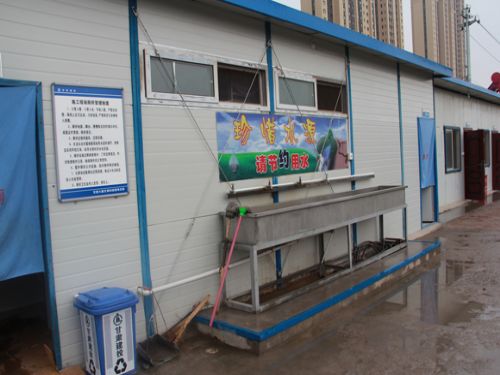 傳統(tǒng)施工時(shí),生活用水和施工用水混合使用,并且沒有循環(huán)利用,污染、浪費(fèi)嚴(yán)重。綠色施工中,生活用水和施工用水嚴(yán)格分開。通過洗漱間的水用過后,要回收利用在衛(wèi)生間里。采訪中,記者注意到這樣一個(gè)細(xì)節(jié),載重卡車駛出工地時(shí),將在門口停頓,兩側(cè)圍欄上隨即噴射出水柱對(duì)沾滿泥土的輪胎和擋板進(jìn)行沖洗。技術(shù)負(fù)責(zé)人劉志剛說,這是項(xiàng)目部?jī)H花了幾千元自行制作的洗車臺(tái),為了防止載重車攜帶泥漿污染市區(qū)道路,而沖洗后的水通過收集、沉淀后二次利用。