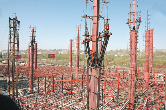 甘肅建投在該工程中使用了大量新產(chǎn)品、新技術(shù)、新工藝,力求打造精品工程,展現(xiàn)甘肅建投的實(shí)力與水平。項(xiàng)目技術(shù)負(fù)責(zé)人左心偉表示:“這項(xiàng)工程大梁為1.6×1.4米,荷載大,對(duì)設(shè)備料投入、支撐體系要求都非常高;而大跨度預(yù)應(yīng)力梁板、后澆帶、土建與鋼結(jié)構(gòu)交叉作業(yè)更增加了施工難度,技術(shù)復(fù)雜程度甘肅少見?!痹摴こ趟袖摻钊渴褂酶邚?qiáng)度的三級(jí)鋼,總重量為6000噸,確?!肮羌堋辟|(zhì)量。在土建工程中,采用了鋼管混凝土澆筑法,50根巨大的圓形鋼管共澆筑混凝土3千立方米,鋼管柱與框架梁鋼筋連接,焊接量非常大。鋼管混凝土與框架梁融為一體,大大提升了結(jié)構(gòu)的堅(jiān)固程度和安全性能。