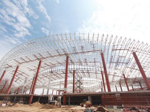 中川機(jī)場(chǎng)新航站樓施工現(xiàn)場(chǎng)最令人震撼的是巨大的網(wǎng)架,如雄鷹翱翔展開的羽翼一樣,縱深197米,橫展336米,姿勢(shì)優(yōu)美,氣勢(shì)壯觀。這是全省鋼網(wǎng)架面積最大、寬幅最寬的網(wǎng)架工程,在新工藝、新技術(shù)方面均有大的突破,很多施工技術(shù)是首次在我省的鋼結(jié)構(gòu)施工中使用,贏得了同行業(yè)的高度贊譽(yù)。中川機(jī)場(chǎng)新航站樓的網(wǎng)架工程,不僅展示了甘肅建投在鋼結(jié)構(gòu)網(wǎng)架方面的領(lǐng)先位置與實(shí)力,同時(shí)也為甘肅鋼結(jié)構(gòu)網(wǎng)架方面樹立了新的標(biāo)桿工程。