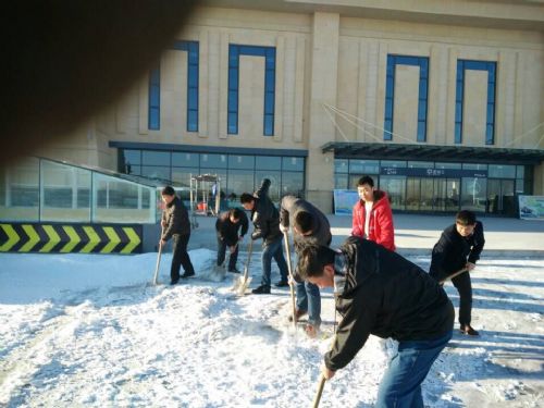 嘉酒分公司機(jī)關(guān)管理人員打掃嘉峪關(guān)火車南站積雪