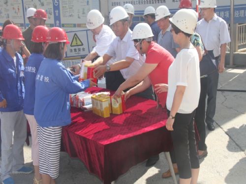 在將防暑降溫用品如茶葉、冰糖、毛巾等慰問品發(fā)送到項(xiàng)目部職工手中后,宋忠慶詳細(xì)詢問了一線職工的身體狀況、高溫天氣下飲水供應(yīng)、食堂伙食等情況,叮囑項(xiàng)目部管理人員,在抓好安全生產(chǎn)的同時(shí),要把關(guān)心職工生活放在突出位置,做好防暑降溫工作,并且提醒工人們要注意在高溫天氣工作要合理安排好作息時(shí)間,注意身體、防止中暑,保證施工安全。最后宋忠慶對(duì)項(xiàng)目部提出幾點(diǎn)要求:一是要加強(qiáng)政治理論學(xué)習(xí),尤其是做好“兩學(xué)一做”學(xué)習(xí)教育工作。二是項(xiàng)目部管理人員要加強(qiáng)專業(yè)知識(shí)和技能的學(xué)習(xí)培訓(xùn)。三是要處理好項(xiàng)目部職工的生活問題,尤其是要把食堂辦好,保障后勤服務(wù)工作。四是項(xiàng)目部防暑降溫設(shè)施和用品要配備齊全,加強(qiáng)高溫天氣下的勞動(dòng)保護(hù)工作。
