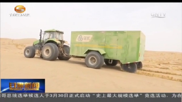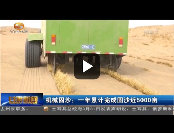 在甘肅武威,眼下,正是固沙治沙的黃金時期,機械固沙車正在涼州區(qū)北部九墩灘、騰格里沙漠南部邊緣開展壓沙作業(yè)。機械設(shè)備利用稻草、麥秸等植物莖桿,在沙漠表面鋪設(shè)草沙障,增加了沙漠表面的粗糙度,消減風力,阻止流沙移動,截流雨水。其鋪設(shè)效率約為5畝每小時,插草深度約15厘米,高度約30厘米,和人工治沙相比,效率提高近50倍。