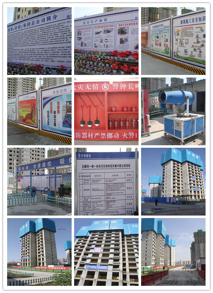 在開工前,甘肅建投建設(shè)公司二公司和直屬分公司就組建了技術(shù)經(jīng)驗豐富和管理水平高超的項目管理班子謀劃前期施工策劃和組織施工,為了確保質(zhì)量,工程開工伊始,建設(shè)公司就制定了確?!敖ㄔO(shè)杯”“白塔獎”,爭創(chuàng)“飛天獎”的質(zhì)量目標。項目部制定了詳細的質(zhì)量控制措施。針對分部分項工程,項目部及時進行施工組織設(shè)計,對于樓梯等混凝土施工較困難的部位采用整體鋼模板澆筑,保證截面尺寸以及樓梯踏步表面的平整度,大大提升了施工質(zhì)量,加快施工進度。項目部對安全施工高度重視,目前為止未有任何安全事故發(fā)生,施工現(xiàn)場采用附著式升降腳手架代替?zhèn)鹘y(tǒng)的懸挑式腳手架,其防護網(wǎng)相比密目網(wǎng)更安全, 防護更到位,大大加快了腳手架爬升速度,節(jié)省材料,節(jié)省人工,縮短了施工周期。在綜合治理的指導(dǎo)方針下,項目部為所有現(xiàn)場工作人員提供質(zhì)量達到國家安全標準的工作防護工具,例如絕緣手套、絕緣鞋、護目鏡、高空防滑鞋等一系列種類齊全的防護用具。同時,施工現(xiàn)場設(shè)有專職安全管理員,對施工人員嚴格要求,凡是進入施工現(xiàn)場人員必須戴好安全帽,凡是高空作業(yè)人員必須系好安全帶,凡是干焊接等對身體具有一定危險性的工作必須做好安全防范措施,如戴好防護措施等。在施工人員閑暇時反復(fù)為工人們講解做好安全工作的重要性,積極為工人們講解做好安全防范工作的小技巧。項目部就施工現(xiàn)場的安全防范工作建立了“一崗雙責(zé)”制度,對于安全工作的責(zé)任分工,進行細化,將責(zé)任落實到人,并建立安全工作處罰條例,對于部分施工人員不把安全當回事,工地逞英雄等一系列惡劣的違反安全條例的行為,一方面進行安全教育,另一方面,對其給予一定的處罰,以提高其安全防范意識。