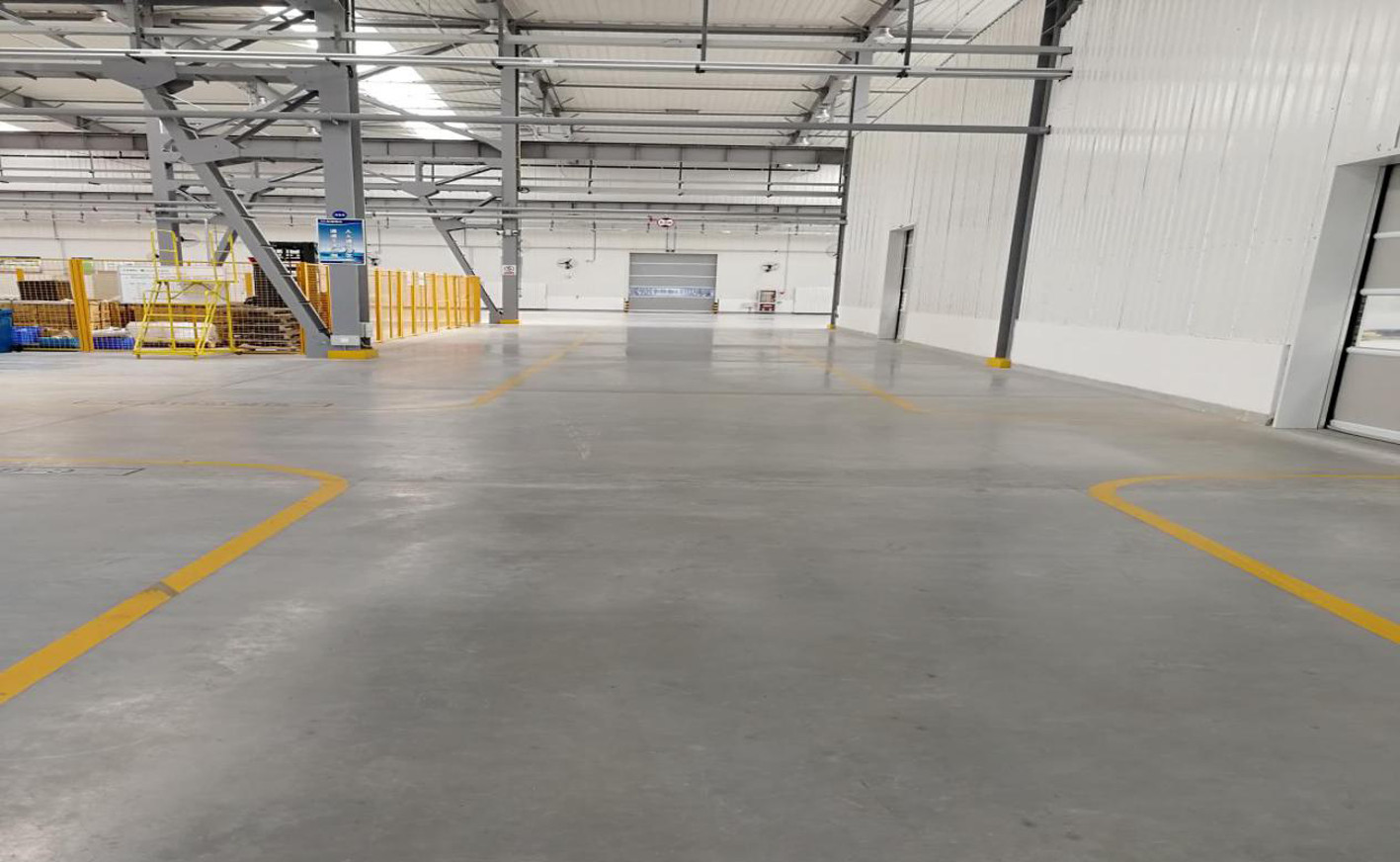 該工程中應(yīng)用了鋼纖維混凝土,通過(guò)在混凝土中摻入一定數(shù)量的鋼纖維,提高了混凝土的抗壓、抗拉、抗彎,抗裂及抗疲勞、韌性等性能。面層耐磨粉與混凝土整體凝固而成,其中摻入的骨料硬度極高,有效提高地坪的耐磨、抗沖擊、抗壓性能,延長(zhǎng)了地坪使用壽命。