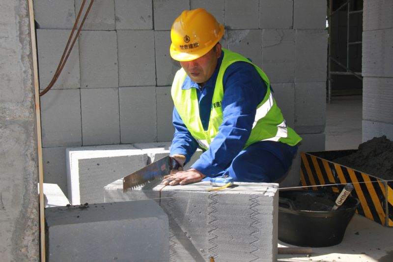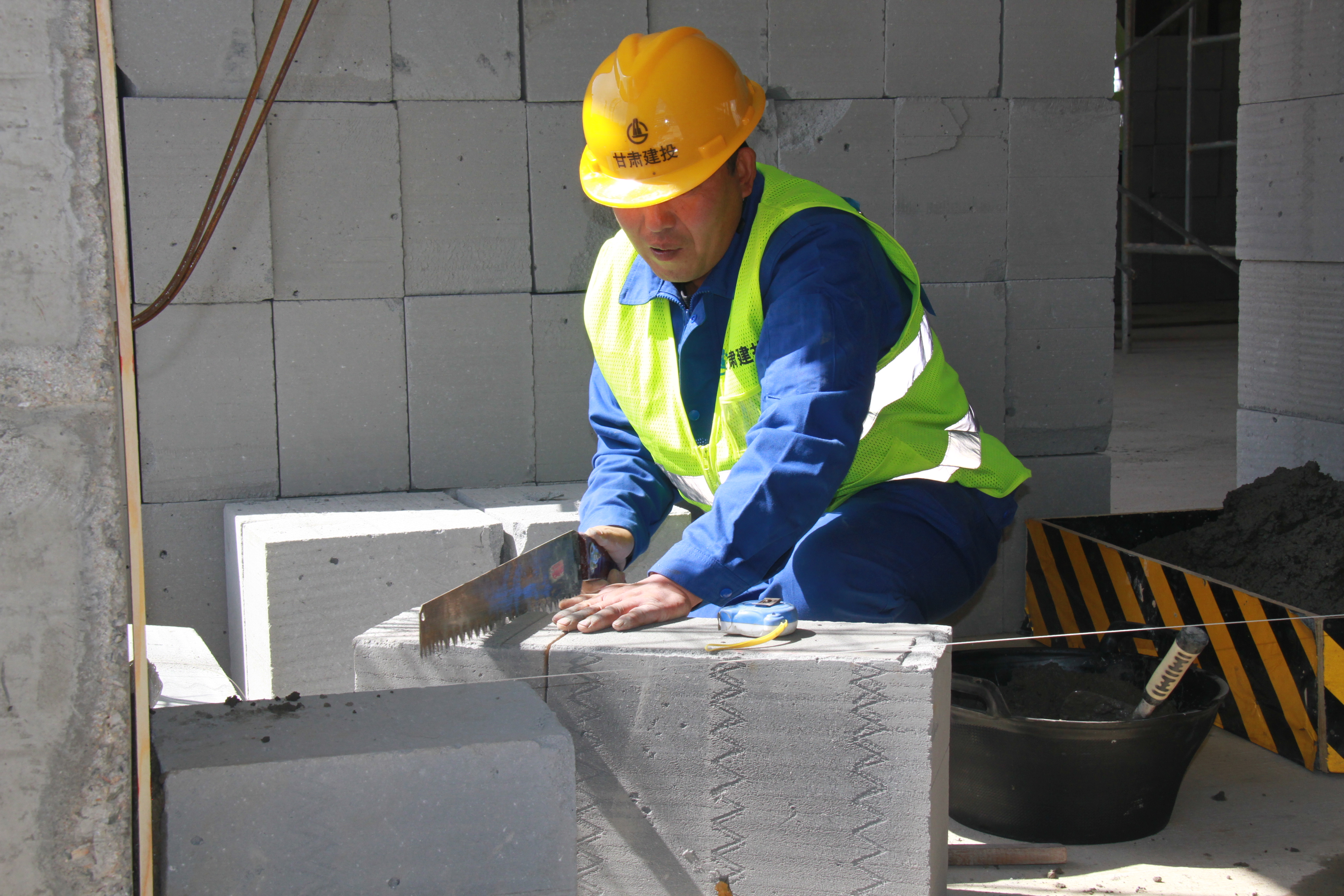 隨后的比賽中,對(duì)全體參賽選手進(jìn)行質(zhì)量交底和安全交底后依次進(jìn)行了理論考試和實(shí)作競賽。現(xiàn)場切割機(jī)長鳴,敲打聲此起彼伏,運(yùn)送著砂漿的拉斗車在飛快穿梭,被熟練操縱的砌磚刀有序地?fù)]舞著,一次次放線、測量,一次次抹灰、敲打,奏響了速度與質(zhì)量的壯美交響樂。此次競賽的砌體水平灰縫厚度及豎向灰縫寬度均為15毫米內(nèi),正、反面墻面均宜進(jìn)行勾縫,對(duì)參賽選手的起評(píng)分提到了一個(gè)新高度。也不見砌筑中常見的吊線錘,選手都是自帶激光水平儀,現(xiàn)場上紅線、綠線縱橫交織,感覺又現(xiàn)代又高級(jí),充分展現(xiàn)了競賽推動(dòng)建設(shè)知識(shí)型、技能型、創(chuàng)新型勞動(dòng)者大軍,弘揚(yáng)勞模精神和工匠精神的活動(dòng)內(nèi)涵。