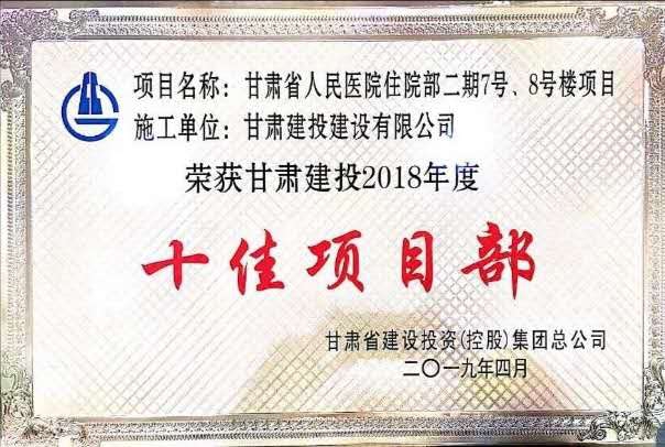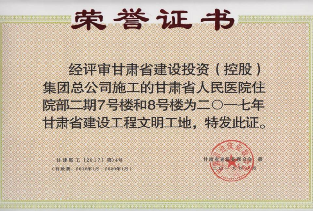 該項(xiàng)目自開工以來,安全文明施工管理取得了一定的成效,接受了省安質(zhì)局、蘭州市城市管理行政執(zhí)法局、蘭州市環(huán)保局、蘭州市綜治辦、蘭州市建設(shè)局等政府主管部門及甘肅建投的多次檢查,均得到了好評(píng),曾一度被評(píng)為甘肅建投系統(tǒng)“安全文明施工”第一名,同時(shí),項(xiàng)目的安全文明施工成果也得到了建設(shè)單位、監(jiān)理單位以及社會(huì)各界的認(rèn)同和贊譽(yù)。在2017年,甘肅省人民醫(yī)院項(xiàng)目部被甘肅省建筑業(yè)聯(lián)合會(huì)評(píng)為甘肅省建設(shè)工程文明工地。2018年度甘肅省人民醫(yī)院住院部二期7號(hào)樓和8號(hào)樓項(xiàng)目被中國(guó)建筑業(yè)協(xié)會(huì)建筑安全分會(huì)評(píng)為2018年參加全國(guó)范圍組織學(xué)習(xí)交流的建設(shè)工程施工安全生產(chǎn)標(biāo)準(zhǔn)化工地。